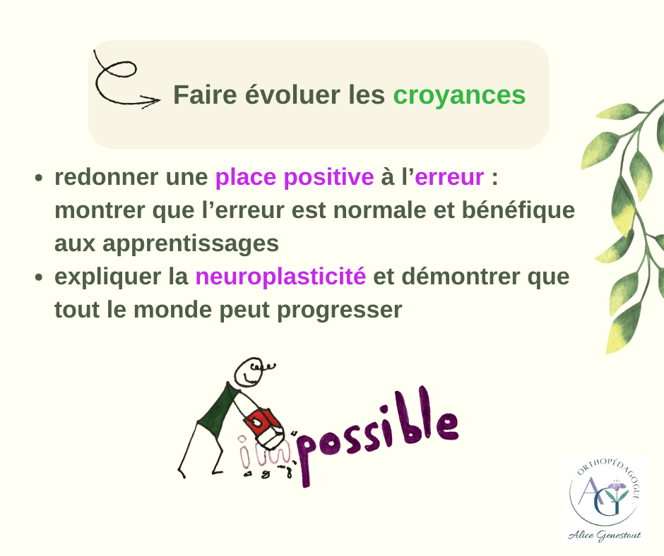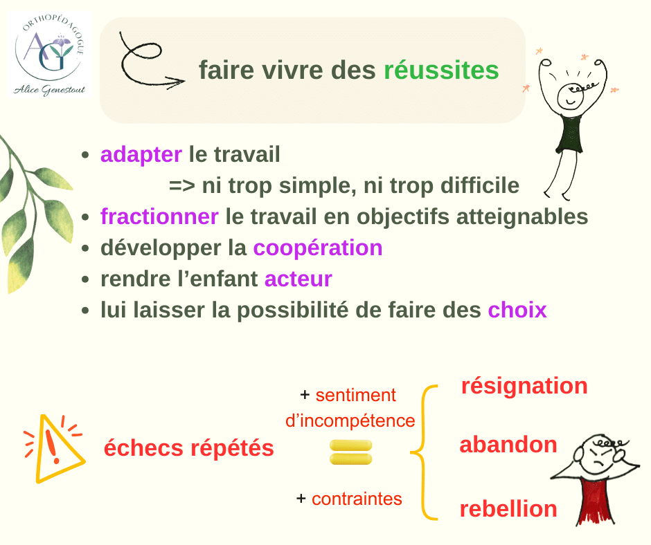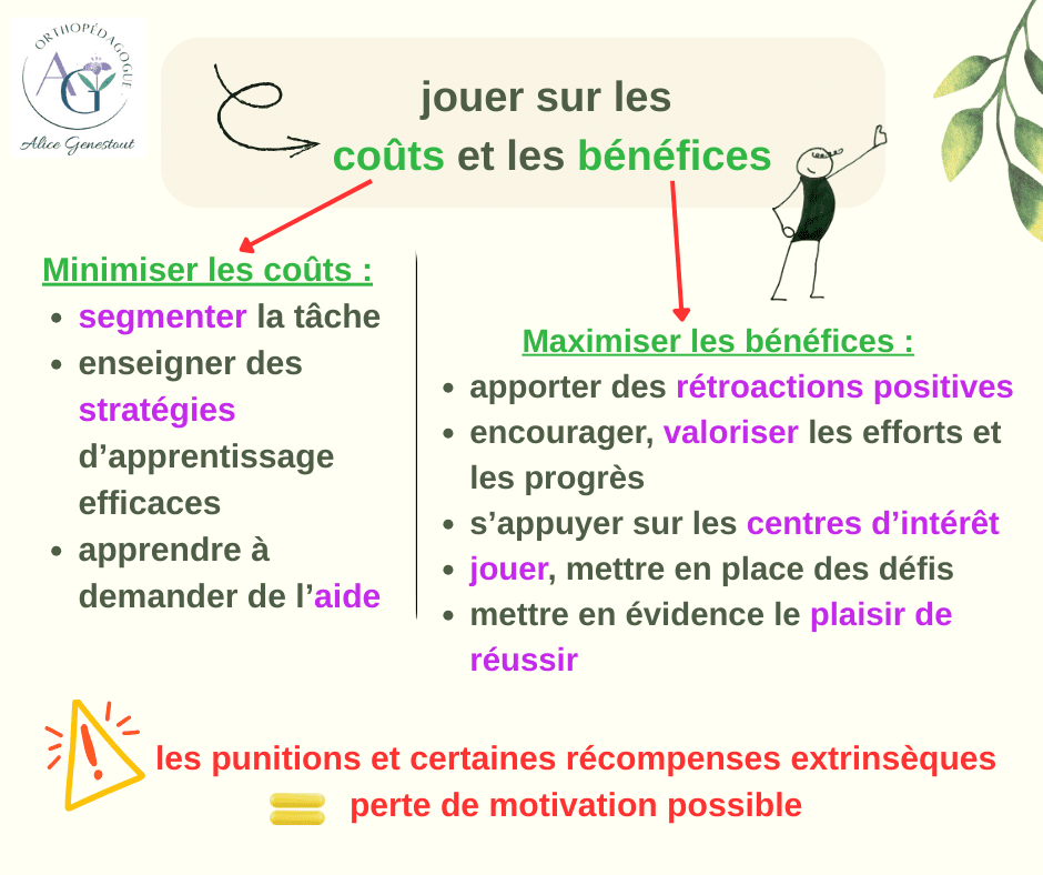Il est possible d’améliorer la motivation, en faisant vivre des réussites à l’enfant, mais aussi en transformant ses croyances, ainsi qu’en minimisant les coûts et en maximisant les bénéfices liés à la tâche .